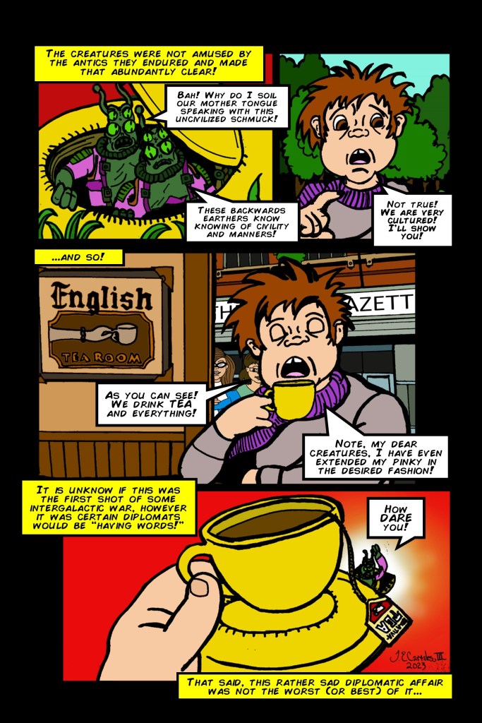It’s Sunday, which means it’s time to jam! This week, Joe Ely Carrales III takes us to the last place you’d expect in a story involving demons and aliens: an English tea room! To get caught up on the shenanigans, head to the Sunday Jam home page.