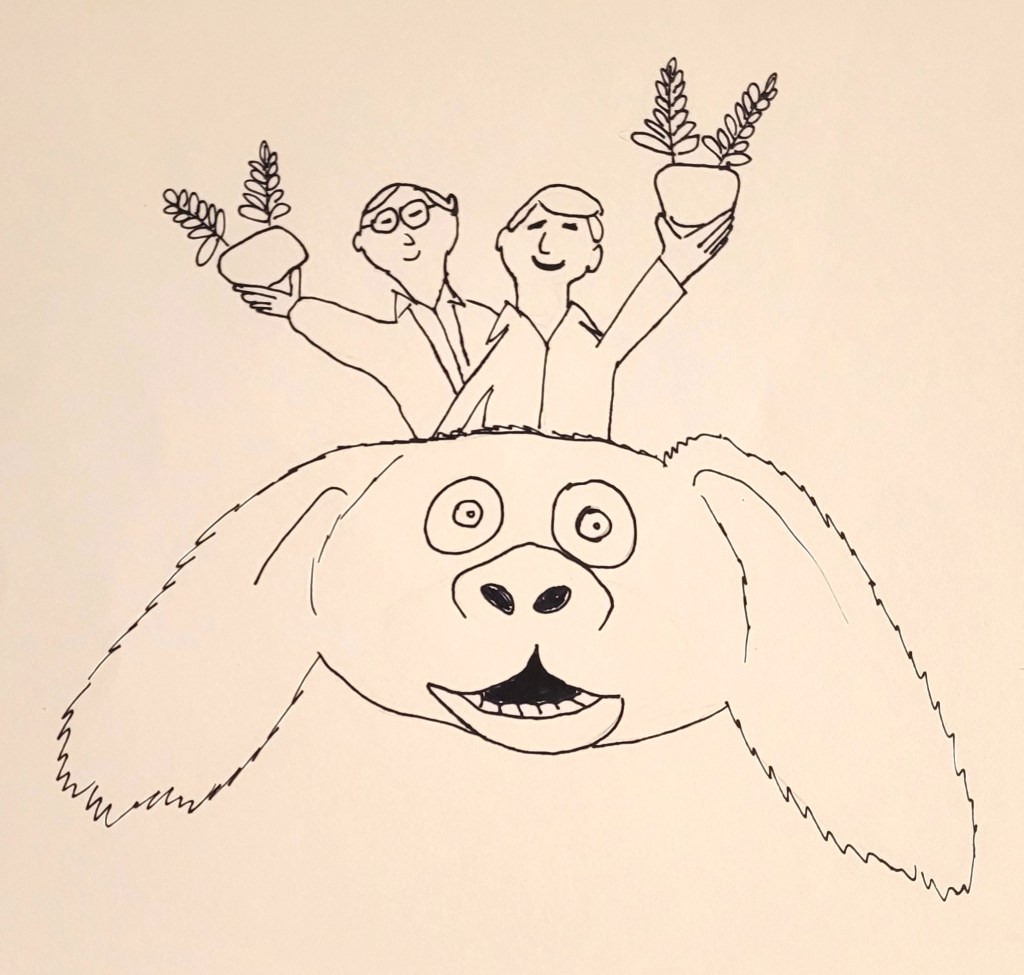 Falkor from “The Neverending Story” being ridden by Charles Grodin, Steve Martin and their ferns from “The Lonely Guy” by Jason DeGroot
