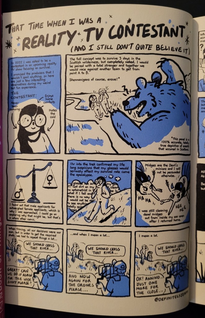 It’s printed on high-quality paper, for one. And it’s beautifully curated as well. The first several pages are devoted to little mini-bios of all the contributors, accompanied by illustrations based off their bios (I think my favorite was the beef rice bowl playing video games). This set the tone that there was a strong respect for each of the artists; that continued throughout the book, where the artists were very clearly identified next to their work. As I’m writing this, I’m realizing reading the book was a bit like walking through a well-curated art gallery.
