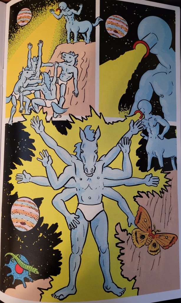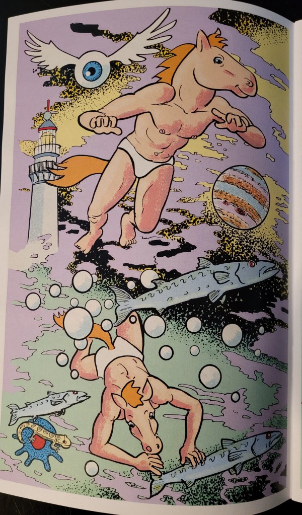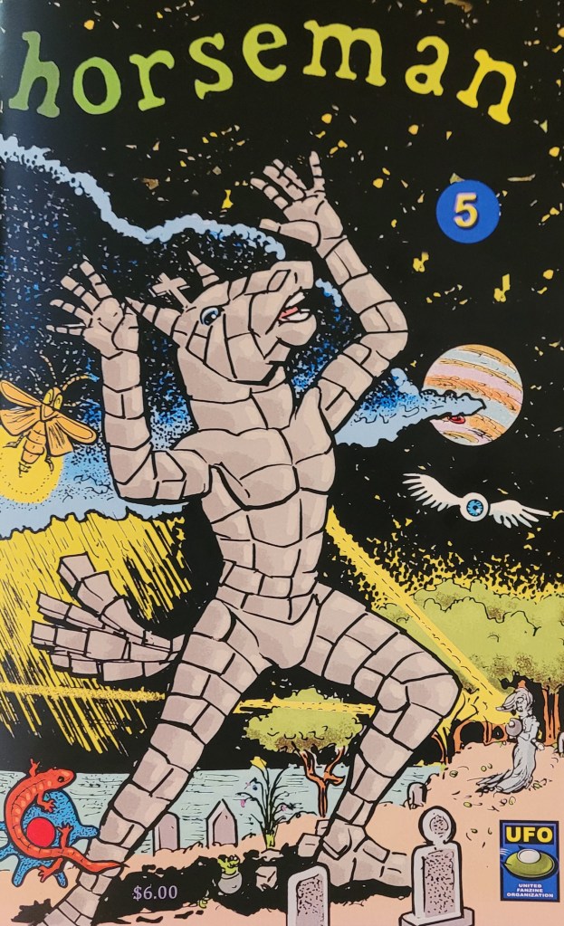 And apologies to genius small presser Larry Johnson for any description I give to this book because he is operating at a level far beyond anything I’ll ever hope to reach. But this particular issue of Horseman involves the titular hero floating through reality and encountering lighthouses and floating eyeballs and death. At least, that’s what I think it’s ostensibly about.