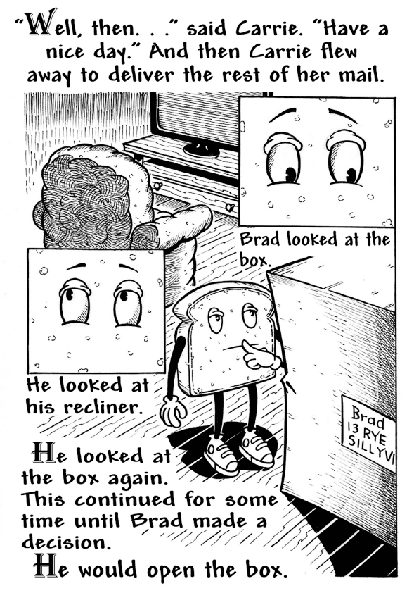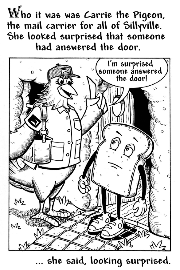 Brad was a slice of bread who had nothing to do all day except watch Sillyville Public Access. Until Carrie R. Pigeon delivered a mysterious package that would change Brad’s life forever! Join Brad and Carrie in a tale for all ages about new friends, new journeys and the magic of the mail!