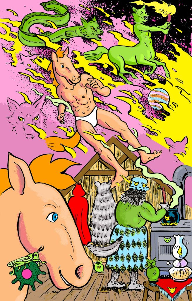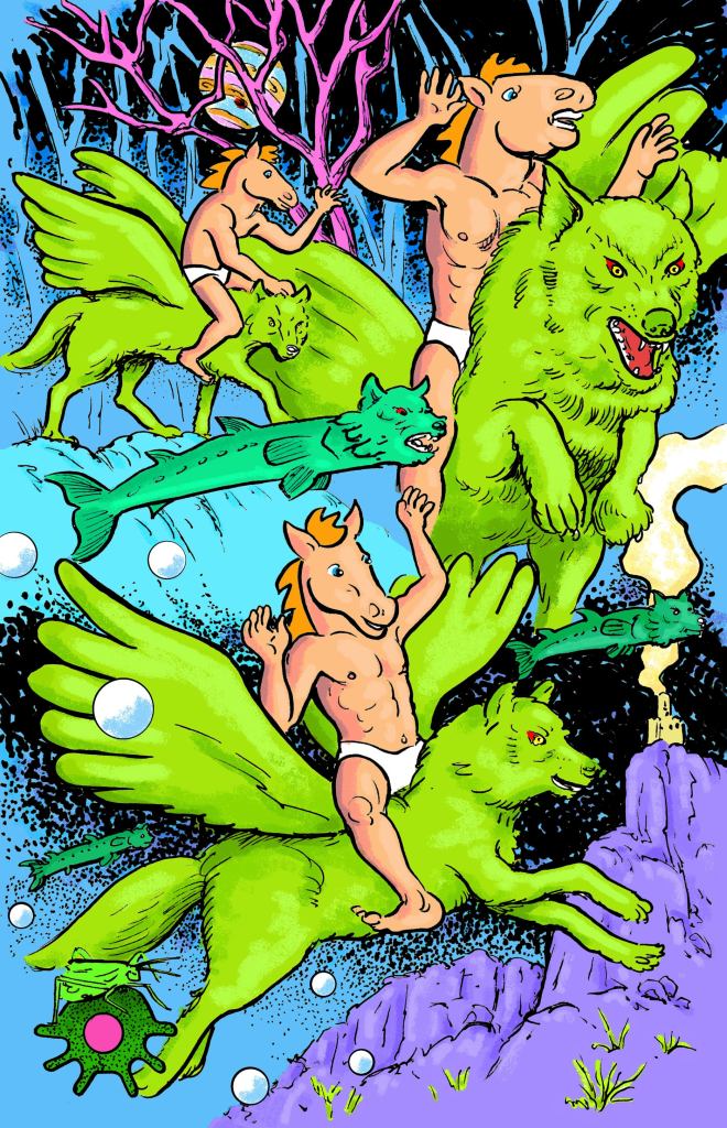 hat happens when Horseman is possessed by a strange wolf-like creature? His spirit is forced out of his body and he is morphed into a new type of being! He tags along with this new creature on a journey with many twists and turns in this new adventure, “Cry Wolf!”