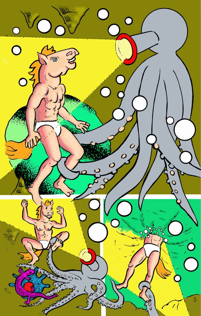 A lighthouse, aliens, a cemetery by the sea, and a mysterious lady with a lamp pitted against Horseman! What happens? All kinds of transformations! Our favorite horse-headed fellow has all kinds of experiences in this issue’s offering, “Light”!