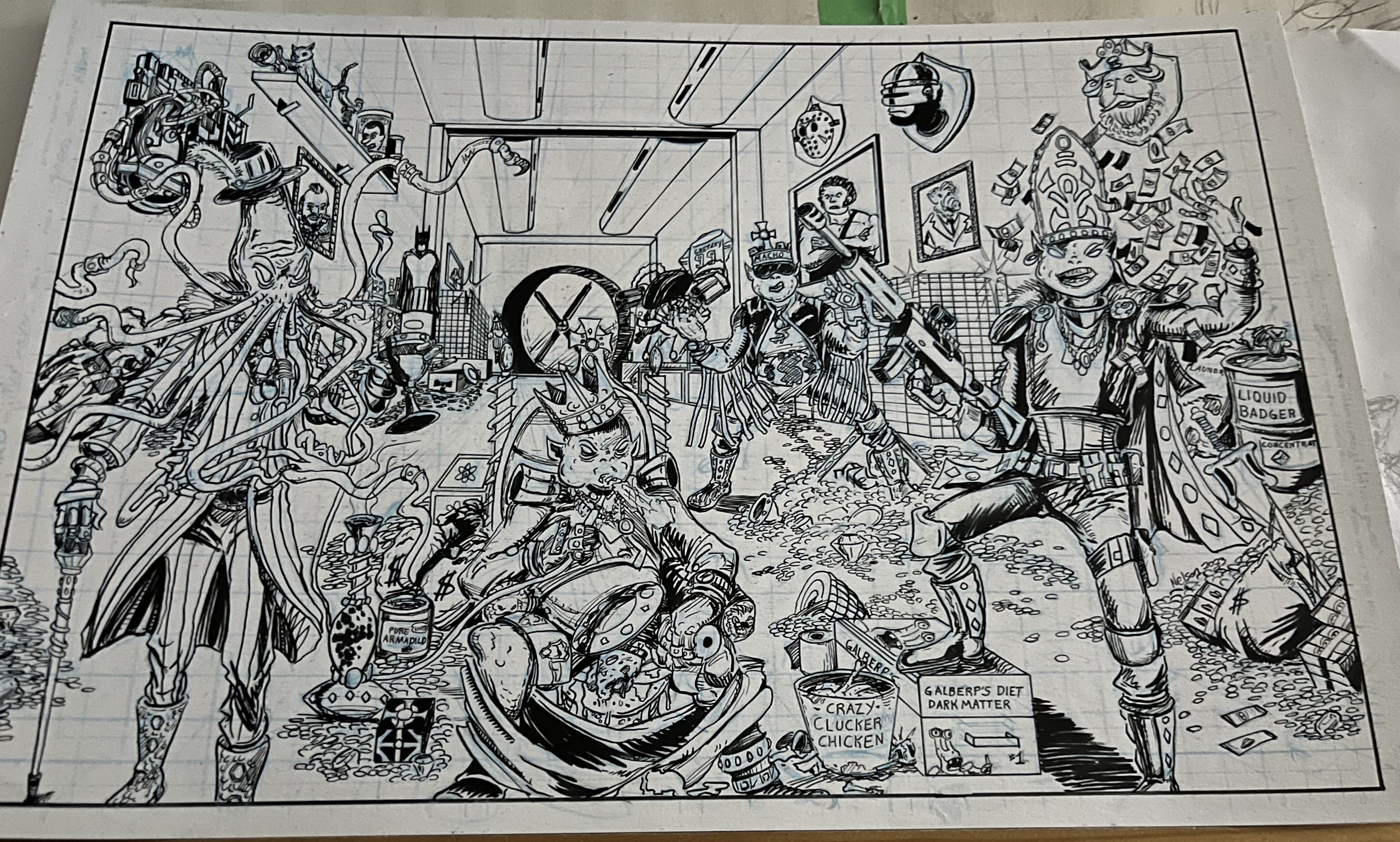 I keep it simple, I’m a traditionalist. I don’t use the computer too much; I prefer hand tools. Brushes made with the hairs of Dire Sables, Pen Nibs mostly crow quills forged in the depths of the earth by sinister Grey Dwarves. With these I use super black ink that I acquired while gambling with a Giant Squid. Also on occasion I use microns though I’m hard on them.